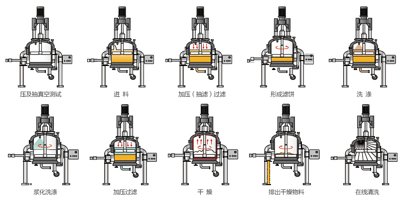 過濾用途:過濾結晶或顆粒類物料,過濾所需液體,洗滌所需固體物料,干燥所需固體物料。